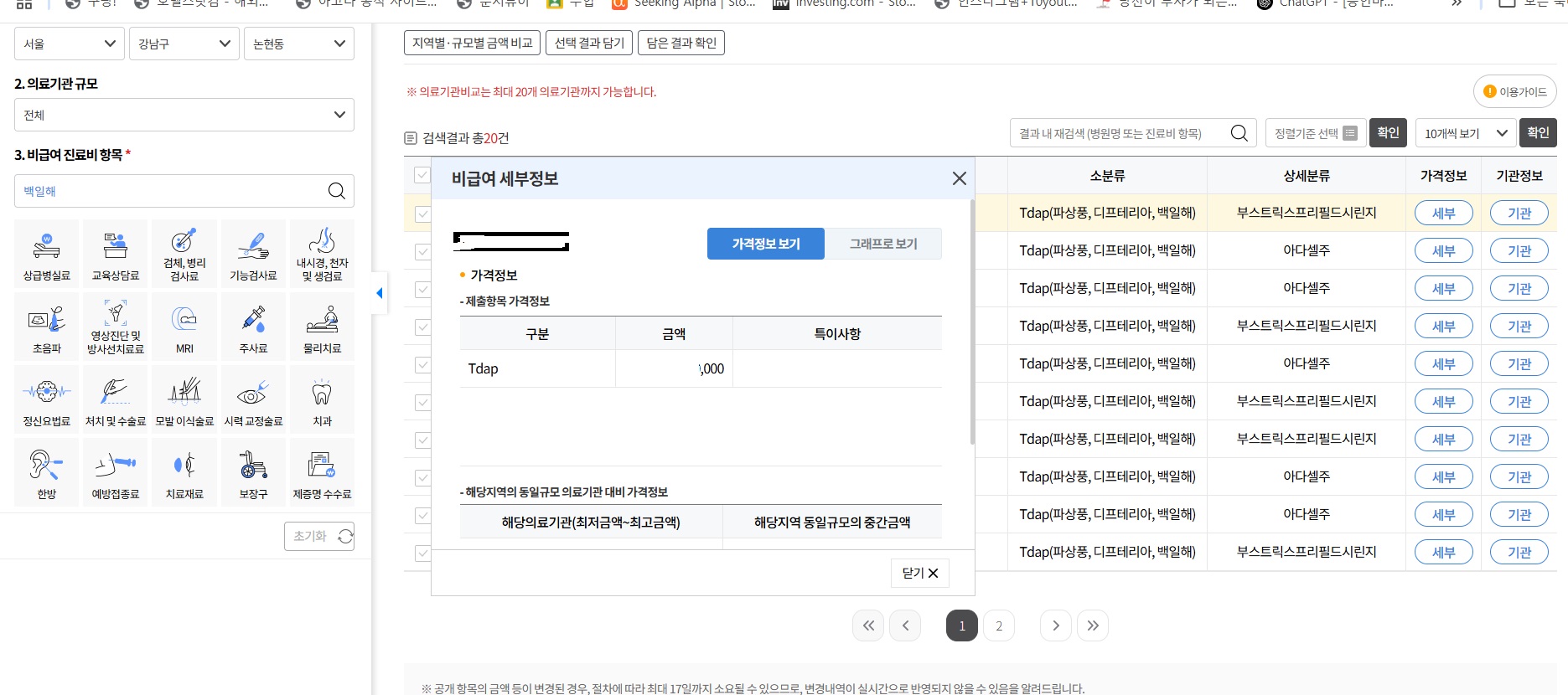 4. 병원 확인 및 가격 조회 (가격정보-세부 클릭시 가격정보 확인 가능)