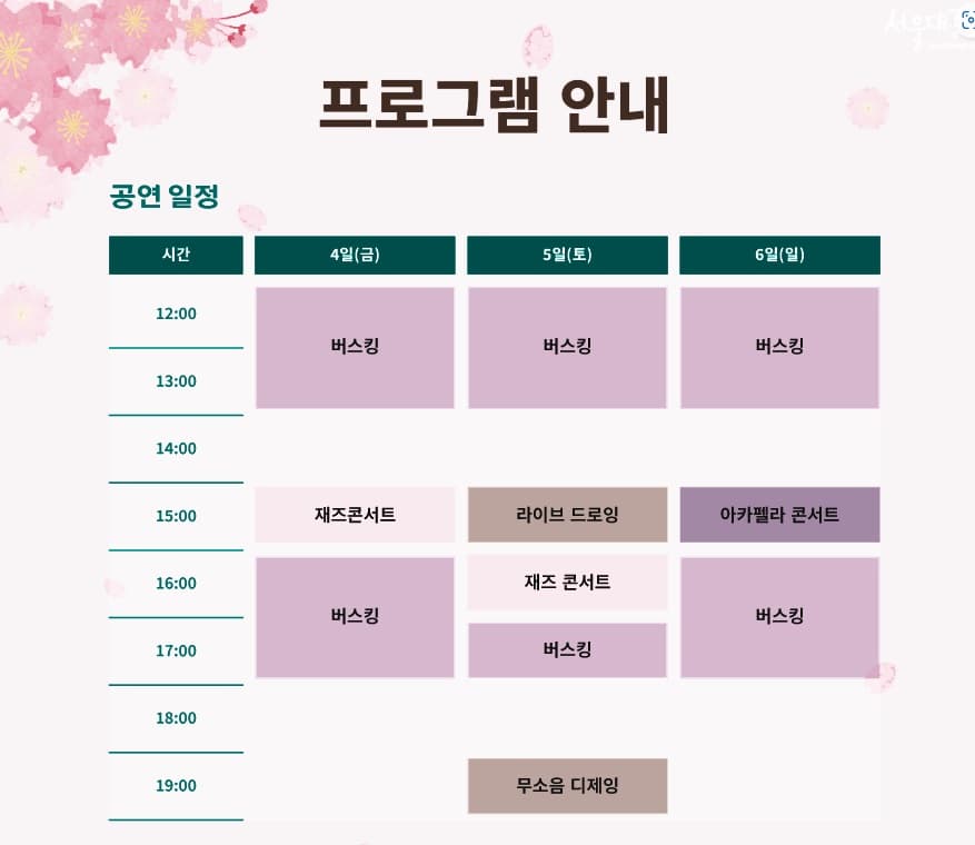 • 축제 내용:  공연,  푸드트럭, 벚꽃 만개 콘서트, 프리마켓